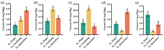 The contents of vitamins, including vitamin B1 (thiamin), B2 (riboflavin), B3 (niacin), B6 (pyridoxine), and C (ascorbic acid), in the S. alterniflora tender stems were measured and are depicted in Figure 3. The S. alterniflora tender stems accumulate abundant levels of vitamin B1, B2, B3, and B6. Among the tested samples, the Sa_Quanzhou tender stems exhibited the highest levels of vitamin B1, at 4.69 mg/100 g (Figure 3a), compared to the Sa_Lianjiang (2.86 mg/100 g) and the Sa_Xiapu (2.85 mg/100 g) samples, which is notably higher than the Sa_Lianjiang (2.86 mg/100 g) and Sa_Xiapu (2.85 mg/100 g) samples and substantially greater than the levels found in Z. latifolia swollen culms (0.02 mg/100 g) [51], leeks (0.06 mg/100 g) [55], asparagus (0.14 mg/100 g) [56], and bamboo shoots (0.15 mg/100 g) [46].