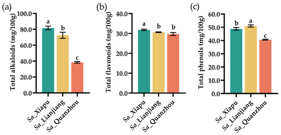 Contents of antioxidants in S. alterniflora tender stems (mg/100 g, fresh weight). The amounts of total alkaloids (a), total flavonoids (b), and total phenols (c) were measured in S. alterniflora tender stems from the Xiapu (indicated as Sa_Xiapu), Lianjiang (Sa_Lianjiang), and Quanzhou (Sa_Quanzhou) areas. The statistical differences between groups were assessed using p-values (<0.05) and represented with alphabetical letters (a–c).