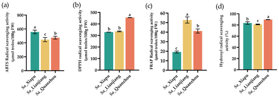 Antioxidant activities of S. alterniflora tender stems (fresh weight) were evaluated by ABTS (a), DPPH (b), FRAP (c), and hydroxyl radical scavenging activity (d). Sa_Xiapu, Sa_Lianjiang, and Sa_Quanzhou indicate S. alterniflora tender stems from the Xiapu, Lianjiang, and Quanzhou areas, respectively. The error bars in each column were calculated based on standard deviation (SD) in three replicates. The statistical differences between groups were assessed using p-values (<0.05) and represented with alphabetical letters (a–c).