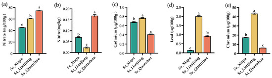 Contents of nitrate (NO3−), nitrite (NO2−), and heavy metals (cadmium, lead, chromium) in S. alterniflora tender stems (fresh weight). (a–e) indicates the amount of nitrate (NO3−), nitrite (NO2−), cadmium (Cd), lead (Pb), and chromium (Cr) in S. alterniflora tender stems, respectively. Sa_Xiapu, Sa_Lianjiang, Sa_Quanzhou indicates S. alterniflora tender stems from Xiapu, Lianjiang and Quanzhou areas, respectively. The error bars in each column were determined by calculating the standard deviation (SD) from three replicates. Statistical differences between groups were evaluated using p-values (<0.05) and are denoted by alphabetical letters (a–c).