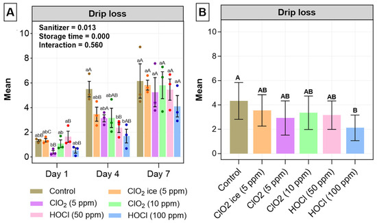 Drip loss (%) changes in salmon fillets for 7 days post-sanitisation. Values are expressed as mean ± standard deviation from three biological replicates per day. (A) Drip loss (%) of all treatments during the 7-day study. Significant differences between the treatments within individual days are indicated with lowercase letters, whereas significant differences in each treatment across storage time are indicated with uppercase letters. (B) Pooled data of treatments to identify the mass effect of sanitiser on drip loss. Significant differences are labelled with uppercase letters. The level of significance is set at p < 0.05. the p-values of storage time, treatment, and interaction are obtained from a two-way ANOVA test.
