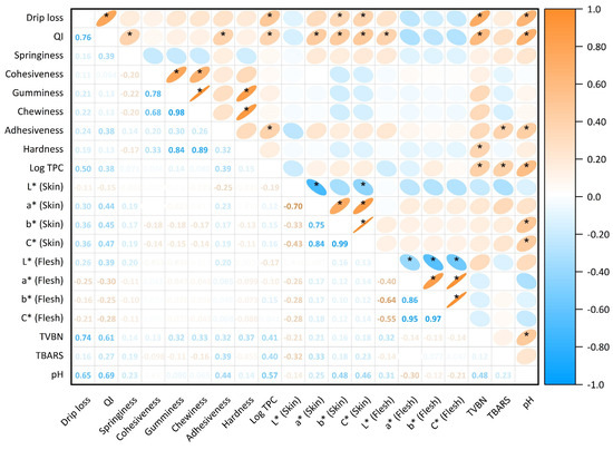 Pearson’s correlation matrix of all investigated parameters in the current study. Significant correlations are labelled with (*). For visualisation purposes, positive correlations are coloured in orange, while negative correlations are represented in blue. The intensity of the colour and a reduction in the size of the ellipse indicate the significance of the relationship.