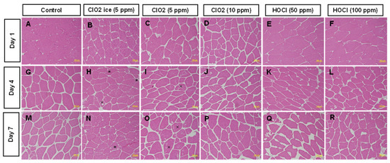 Transversal section of muscle tissue of salmon fillets for 7 days post-sanitisation. Figure was labelled from (A–R) according to treatments and storage time. (*) Indicates loss of integrity of sarcolemma, characterised by indistinct margins; (×) indicates intrafibrillar cavities, characterised by spacing between myofibrilla within muscle fibre.