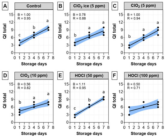 Quality index (QI) changes in salmon fillets for 7 days post-sanitisation. (A) Control; (B) ClO2 ice (5 ppm); (C) ClO2 (5 ppm); (D) ClO2 (10 ppm); (E) HOCl (50 ppm); (F) HOCl (100 ppm). The relationship between storage day and drip loss in individual treatments is expressed as the Pearson’s correlation coefficient (r) and unstandardised regression coefficient (B). Significant differences within treatments across different days are indicated with lowercase letters. No significant differences were detected when comparing individual treatments on each sampling day.