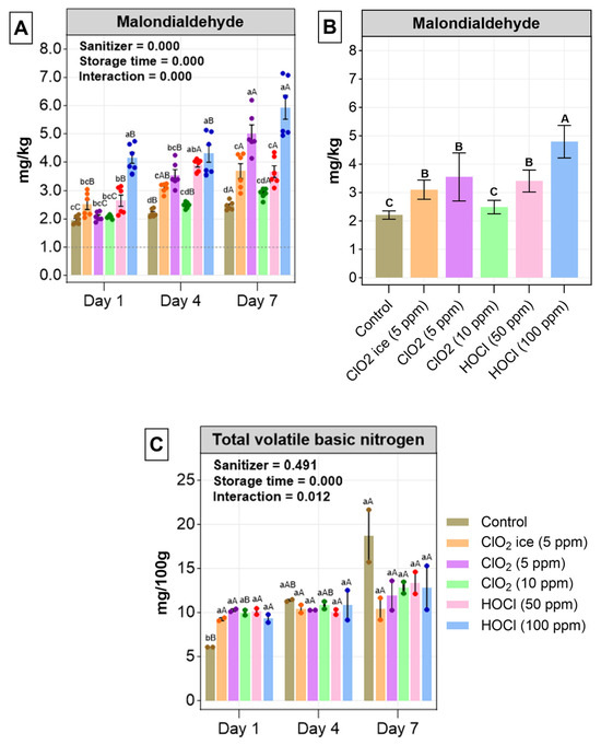 Lipid oxidation (A) and total volatile base nitrogen (TVB-N) (C) across treatments during the 7-day study. (B) General lipid oxidation across treatment. Values are expressed as mean ± standard deviation from three biological replicates per day. In (A,C), uppercase letters indicate significant differences between storage for individual treatment, and lowercase letters indicate significant differences between treatments during each sampling day. In (B), significant differences between treatments are indicated with uppercase letters. The level of significant is set at p < 0.05. p-Values of storage time, treatment, and interaction were obtained with a two-way ANOVA test.