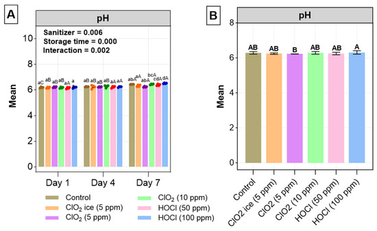 (A) pH changes in salmon fillets for 7 days post-sanitisation. (B) General effects of treatments on pH. Values are expressed as mean ± standard deviation from three biological replicates per day. In (A), the uppercase letters indicate significant differences between storage for individual treatment and the lowercase letters indicate significant differences between treatment during each sampling day. In (B), significant differences between treatments are indicated with different uppercase letters. The level of significance is set at p < 0.05. p-Values of storage time, treatment, and interaction were obtained from two-way ANOVA test.