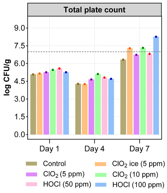 TVC is an index commonly used to investigate the microbial quality of food, and the maximum acceptable limit for quality and freshness of fish products is generally a value of 7 log CFU/g [67]. The TVC value on days 1 and 4 being below 6.00 log CFU/g increased in salmon fillets treated with sanitisers in comparison with control fillets but remained below the acceptable limit (Figure 7). This may suggest that both ClO2 and HOCl can prevent the proliferation of spoilage bacteria until day 4. A similar effect of 15 and 50% of HOCl was observed in the study of Khazandi, Deo, Ferro, Venter, Pi, Crabb, Amorico, Ogunniyi, and Trott [32], who reported TVC below the acceptable limit until day 3 in King George Whiting (Sillaginodes punctatus) fish fillets, and repeated wash (10 s + 5 min) decreased overall bacterial loads in salmon dipped in either 15 or 50 % of HOCl solution. Additionally, immersion of various fish products in electrolysed water solution and ice containing HOCl has been reported to produce anti-microbial activity in various studies, summarised in the review by Ramírez Orejel and Cano-Buendía [84]. Meanwhile, in the current study, salmon fillets treated with ClO2 ice (5 ppm), ClO2 (10 ppm), and HOCl (100 ppm) exceeded the permissible limit of the TVC value on day 7. The low TPC count in the control fillets could mostly be linked to minimal myofibrilla damage, as indicated in the control, while the damage in other treatments led to an increase in cell lysis, resulting in increasing nutrients available for microbes. The changes in TVC on days 1 and 4 were consistent with changes of TVC in whole salmon muscle on days 1 and 3 [31] but exceeded the limit of TVC on day 7 in the present study. This was not consistent with the findings of Kim, Huang, Marshall, and Wei [31], who reported TVC values within the acceptable limit. However, keeping dosage and method differences in mind, the negative results in the current study could have been due to the usage of a relatively low dosage and the current dipping method. In a previous study by Khazandi, Deo, Ferro, Venter, Pi, Crabb, Amorico, Ogunniyi, and Trott [32], it was suggested that bacterial load could be maintained within the acceptable range following a single 5 min wash with chlorine-based sanitisers. Hence, further study is needed to optimise sanitisation methods, including factors such as dipping methods, the introduction format (e.g., ice, wash or dip), and the usage of a larger range of sanitiser dosage to extend the shelf life of Atlantic salmon.