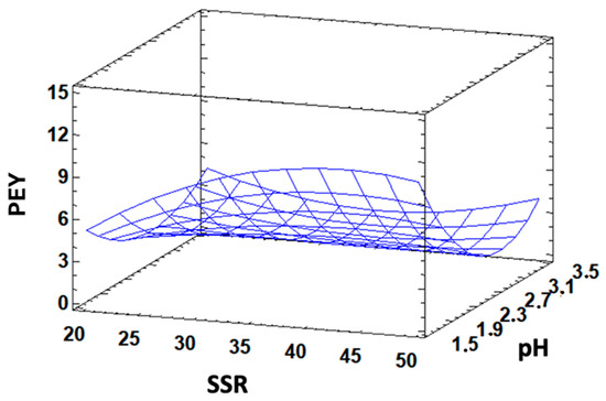 Response surface plot showing the effect of SSR and pH on pectin yield (PEY) at 70 °C and 10 min extraction time.