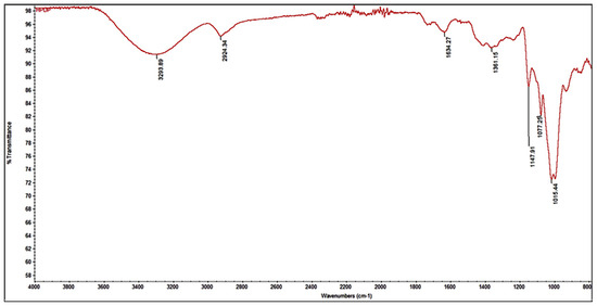In fact, the band in the range of 3200–3600 cm−1 corresponds to the vibration of both the intra- and inter-hydrogen bonds of OH groups within the pectin molecule. This vibration was particularly strong at 3294 cm−1. Another notable peak at 2924 cm−1 can be attributed to the stretching of the C-H bonds in the methyl groups present on the sugar rings of the molecule structure. Furthermore, two distinct absorption bands between 1770 cm−1 and 1600 cm−1 indicated the presence of C=O groups, specifically methyl-esterified (COO-R) and ionic carboxyl (COO-) groups. It is important to note that the relative intensity of the ester band increased according to the DE of the pectin (a higher DE corresponds to a stronger intensity in the ester band), while the intensity of the carboxylic stretching band decreases [17]. The 1200–1800 cm−1 range, known as the fingerprint region, reveals distinct bands characteristics for PP pectin. Notably, the typical peaks at 1077 cm−1 and 1015 cm−1 were correlated with the vibration of neutral arabinose and galactose-based glycans within the pectin molecule [17].