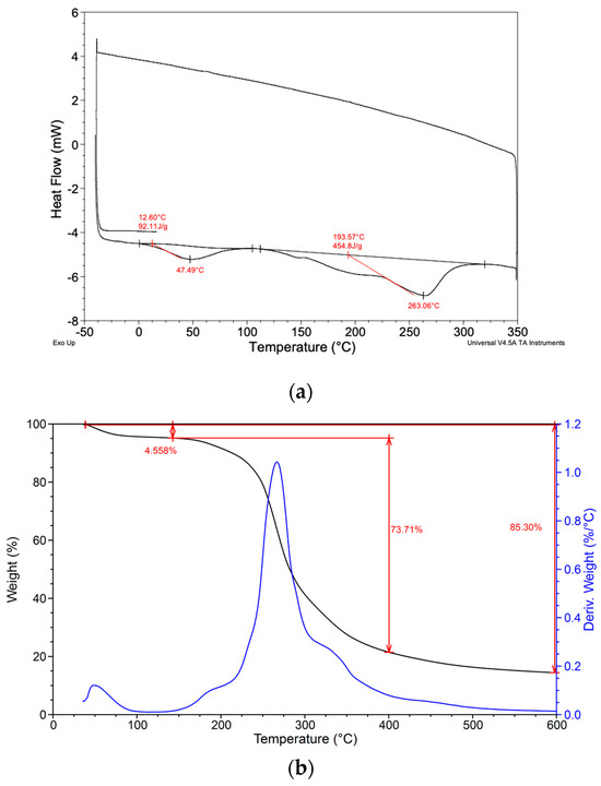 Additionally, thermal analysis using DSC (Figure 3a) supported the presence of physically bound water, which is released at temperatures below 100 °C, and revealed multiple decomposition processes occurring up to 263.06 °C. TGA data confirmed a weight loss of 4.6%, corresponding to the removal of free water from the sample (Figure 3b). A more significant loss of water was observed between 200 °C and 350 °C, indicative of the pyrolytic decomposition of the pectin chain and the cleavage of hydrolytic bonds. These processes continued until the complete decomposition of organic substances at 600 °C, leaving behind a carbon-based inorganic skeleton. These findings aligned with the trends observed in the thermal performance of an ultrasound assisted extracted pectin (UAEP) from citrus peels by Panwar et al., highlighting a greater thermal stability of UAEP from food wastes compared to the commercial citrus pectin [25].