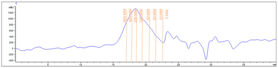 The Mw and the DE highly affect the application field of pectin. Therefore, these parameters were investigated to gain more insight on the chemical features of the isolated polysaccharide. SEC was used to investigate the average Mw and Mw distribution of PP pectin, after the construction of a calibration curve with pullulans (using the external standard method). The molecular parameters were extrapolated by the chromatogram registered for PP pectin (Figure 4) which highlighted the presence of a heterogeneous population of polymers possessing a number average molecular weight (Mn) of 131.33 ± 3.53 kDa and an average Mw of 351.55 ± 31.40 kDa, higher than that observed for pumpkin peel pectin isolated by other researchers [17,35]. The dispersity index (PDI) calculated as the ration Mw/Mn was of 2.67 ± 0.18, a value which closely resembled that of the commercial citrus pectin (PDI = 2.0 ± 0.0), which can be attributed to the high purity of pectin [35]. The Mw distribution was quite narrow, thus confirming the results obtained by Mendez et al. [35] for watermelon rinds pectin obtained under extraction conditions very similar to those applied for PP pectin (i.e., high-temperature (95 °C) and low-pH (about 1)), even if PP pectin Mw was higher (watermelon rinds pectin Mw 106 ± 2.69 kDa). Conversely, Torkova et al. [17] reported lower values ranging from 72.2 ± 7.7 kDa to 169.1 ± 16.0 kDa while Salima et al. [34] found 171.25 ± 39.26 kDa. Remarkably, our PP pectin exhibited a Mw value similar to that reported by Salima et al. [34] for pumpkin pulp (407.48 ± 8.45 kDa), as well as for some commercial citrus pectin (389.3 ± 9.1 kDa) and sugar beet pulp pectin (590.3 ± 11 kDa) [36]. Indeed, to the best of our knowledge, pectin extracted from Mantua pumpkin peels has never been investigated before this work.
