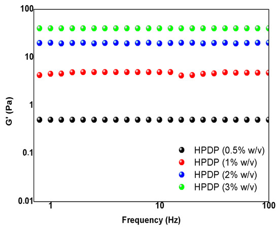 Preliminary rheological studies were also performed on PP pectin to investigate the viscoelastic properties. Three different concentrations (0.5, 1, 2, and 3%, w/v) of pectin aqueous solution were tested by using shear-rate rheology. In Figure 6 the mechanical properties of pectin solution are reported. The storage modulus (G’) represented the stiffness, and it increased by increasing pectin concentration (from 0.5 to 60 Pa). This behavior aligned with the typical patterns observed for soft hydrogel matrices and it can be attributed to the formation of entanglements between pectin chains at the highest concentrations, resulting in enhanced material stiffness. Consequently, these properties could be linked to the concentration of pectin in the solution. In fact, as noted in the rheological studies, the G’ increased with the concentration of pectin, indicating the formation of a stronger network. This suggests that, at higher concentrations, the pectin molecules form entanglements or interactions that lead to a gel-like behavior, where the G’ becomes independent of frequency. These entanglements could be the result of hydrophobic interactions and hydrogen bonding between the pectin chains, which are especially prominent in high methoxyl pectins like the one described in this study.