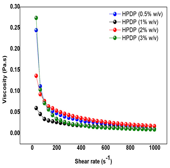 The rheological properties of PP samples (PP aqueous solution) were investigated using a Kinexus DSR Rheometer (Netzsch, Selb, Germany) equipped with a parallel-plate geometry (acrylic diameter 20 mm; gap 34 μm). Sample viscosity was measured using a flow step program with increasing shear rates (0.001–1000 s−1) to examine their non-Newtonian behavior and their tendency to exhibit shear-thinning. To assess the storage (G’) modulus PP, frequency sweep experiments were conducted as a function of angular frequency (0.1–100 Hz) at a fixed strain of 1%. Each experiment was performed in triplicate, and data were processed using OriginLab software (OriginPro 2024b).