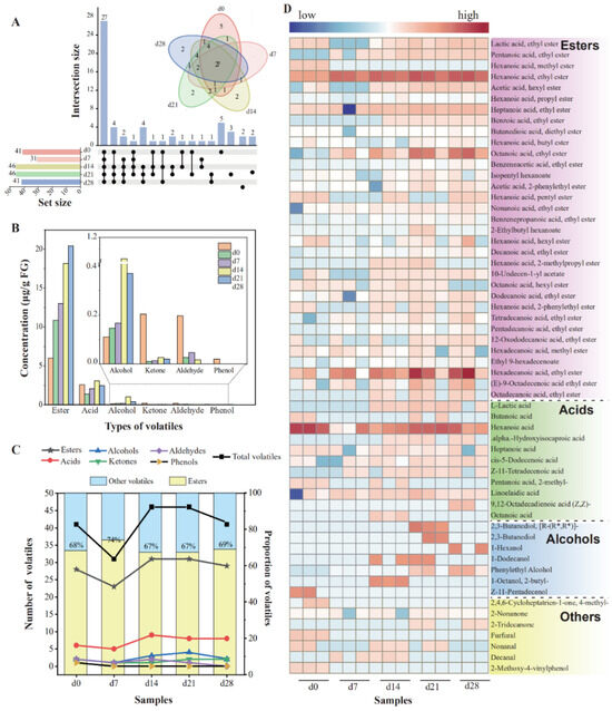 Changes in the contents and numbers of the volatile compounds from FG samples during fermentation. (A) The number of shared and unique volatiles presented by Upset diagram; (B) concentration of volatiles; (C) numbers and proportion of volatiles of FG; (D) heatmap of 58 volatiles in FG during fermentation.