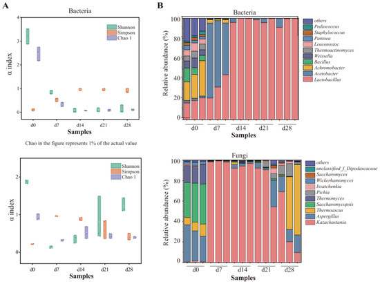 Changes in bacterial and fungal communities during fermentation: (A) microbial diversity; (B) distribution of the microbial community at genus level.