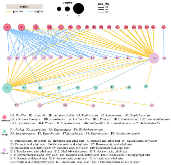 Correlation between 33 esters and dominant genera (relative abundance > 1%) in FG samples. Yellow and blue edges represent positive and negative correlations, respectively. For networks of bacteria and fungi, Spearman’s r > 0.7 or < −0.7 and Spearman’s r > 0.6 or < −0.6, respectively, p < 0.05.