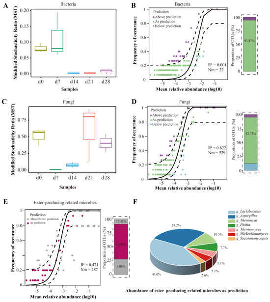Microbiota assembly patterns in FG during fermentation. (A–D) Modified stochasticity ratio (MST) and Sloan neutral model of bacteria and fungi; (E) Sloan neutral model of ester-producing related microbes; (F) abundance of ester-producing related microbes as prediction.