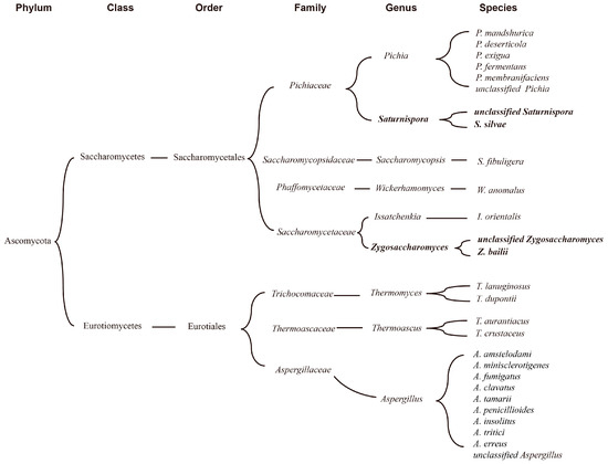 According to the results of correlation analysis, 7 fungal genera related to ester production, namely Pichia, Aspergillus, Wickerhamomyces, Thermomyces, Saccharomycopsis, Issatchenkia, and Thermoascus, were selected from the FG samples. To further understand the ester-producing related microbes in FG samples, a summary of microbes related to ester production obtained via correlation analysis and a culture-based method was made. As shown in Figure 6, they could be divided into two classes, namely Saccharomycetes and Eurotiomycetes. Six out of nine belong to the order Saccharomycetales, and others belong to Eurotiales. Saturnispora and Pichia belong to the Pichiaceae family, while Zygosaccharomyces and Issatchenkia belong to the Saccharomycetaceae family.