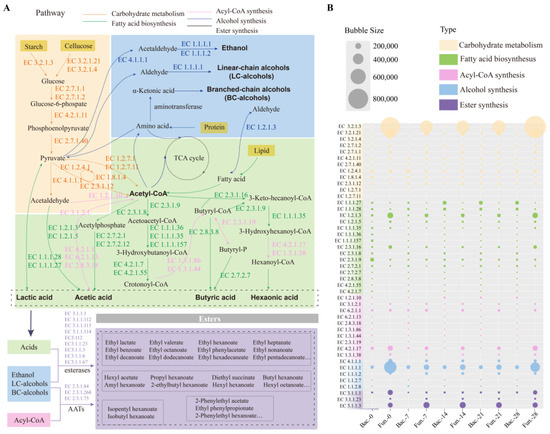 Prediction of the microbial functions in synthesis of esters in FG: (A) metabolic pathways diagram related to esters formation in FG fermentation; (B) the relative abundance of the main enzymes involved in the metabolic pathways.