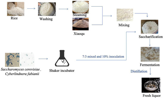Rice-flavor is one of the four dominant aromas in Chinese baijiu. Rice-flavor baijiu is produced through the fermentation of rice using a semi-solid process involving the addition of Xiaoqu starter [1]. The main flavor substances present in rice-flavor baijiu are esters, including ethyl acetate, ethyl lactate, and phenylethanol [2]. These impart a sweet flavor and clean taste to the spirit. Currently, some consumers perceive the main drawbacks of rice-flavor baijiu to be its unexciting and smooth flavor, the absence of a luxurious and subtle aroma, and the esters are lower and less diverse, all of which significantly impact the quality of baijiu [3]. The growth and metabolic processes of the microoraganisms in the fermentation starter exert a profound influence on the flavor of baijiu [4]. The dominant bacterial genera in the starter culture are Lactobacillus, Welchiella, Lactococcus, and Acetobacter, and the dominant fungal genera are Rhizopus, Pichia, Saccharomyces, and Issatchenkia [5,6]. The production of the traditional Xiaoqu starter is conducted in an open, natural setting, utilizing a limited range of raw materials. This approach has resulted in a starter with relatively decreased flavor-producing microbial populations [7]. Over the past few years, there has been a notable rise in the discovery of microoraganisms from traditional fermentation processes that enhance the flavors in baijiu fermentation, for example, Wickerhamomyces anomalus, Saccharomyces cerevisiae, Hyphopichia burtonii, Clavispora lusitaniae, Saccharomycopsis fibuligera, Bacillus velezensis, Bacillus subtilis, and other ester-producing strains. The inoculation of functional microoraganisms into the baijiu fermentation has a positive effect on the microbiota, enzymatic activity, and metabolite composition [8]. The utilization of enhanced cultures can result in an enhancement of the production of the flavor substances and can facilitate the production of beneficial effects in a variety of baijiu [9,10,11,12,13,14,15]. Acetates are important flavor substances, the content of which is an important index to distinguish the quality of rice-flavor baijiu. Acetates were synthesized from the alcohol acyltransferase pathway, alcohol dehydrogenase pathway, and esterification pathway of microoraganisms [3]. Ester-producing yeasts, including Saccharomyces cerevisiae, Clavispora lusitaniae, Cyberlindnera fabianii, and others, possess these pathways and are closely related to the synthesis of various ester substances and precursors in alcoholic beverages [16,17,18]. The inoculation of ester-producing yeast into the fermentation process of Xiaoqu baijiu has been demonstrated to have a positive effect on the production of esters [12,15]. The findings of these studies provide new insights into the means of enhancing the quality of rice-flavor baijiu.