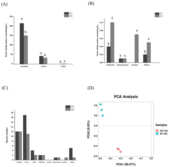 Volatile flavor substances in SY and CK upon completion of fermentation. (A,B) Total concentration; (C) species number; (D) principal component analysis. Note: Columns with different letters indicate significant differences (p < 0.05).