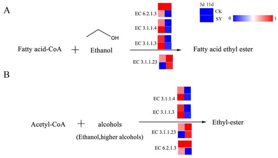 Isobutanol, isoamyl alcohol, β-phenylethanol, and 2,3-butanediol are the alcohols with the highest contents in the fermentation of the two groups. In addition, the OAVs of these alcohols in SY were greater than those in CK. Ethanol is an essential component of baijiu and is primarily synthesized by transforming pyruvic acid into acetaldehyde and then reducing the acetaldehyde. The pathway of the alcohol production and related catalytic enzymes is shown in Figure 3A. In the production of acetaldehyde from pyruvate, three pathways and six enzymes are involved. According to the annotation results of the KEGG, ethanol dehydrogenase (EC 1.1.1.1 and EC 1.1.1.2) participates in the acetaldehyde reduction reaction, and its relative abundance is higher in SY during 3d and 11d of fermentation, respectively, which indicates that a substantial quantity of alcohol was generated during the fermentation. The relative gene abundance of pyruvate dehydrogenase (EC 1.2.4.1) in SY was lower than that of CK. Presumably, the flux of acetaldehyde synthesis via this pathway was lower in SY. 2,3-Butanediol has a creamy and sweet flavor. The pathway of 2,3-butanediol production and related catalytic enzymes is shown in Figure 3B. According to the annotation results of the KEGG, the relative abundances of acetolactate synthetase (EC 2.2.1.6), acetolactate (EC 4.1.1.5), and butanediol dehydrogenase (EC 1.1.1.4) were higher in SY during 3d of fermentation, respectively, which indicates a higher flux of 2,3-butanediol synthesis via this pathway in the pre-fermentation period.