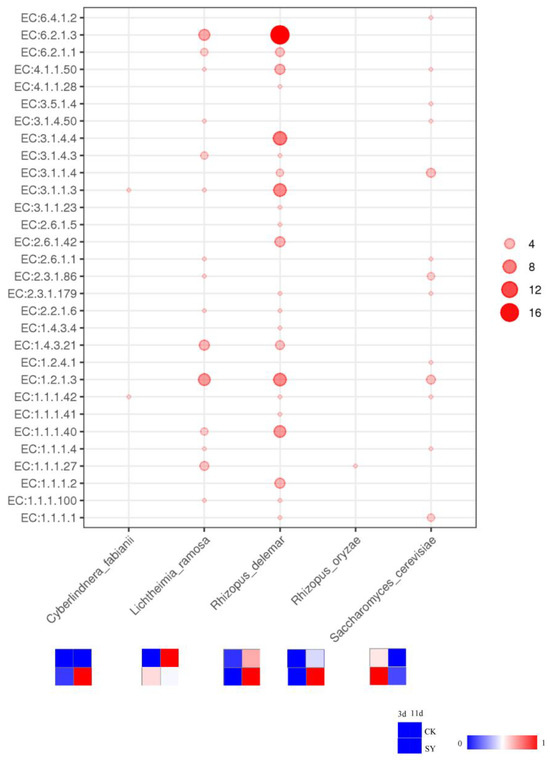 The average relative abundances of the fungi and bacteria in the microbial community of SY were 97.899% and 2.039%, respectively, and those of CK were similar. All the gene abundances of the alcohol, acid, and ester pathways were only annotated to the fungi. The relationship between the microorganisms at the species level and the enzymes involved in the metabolic pathways is shown in Figure 6. The analysis of the microbial communities involved in the synthesis of the flavor substances was attributed to five microoraganisms in SY and CK, which were Cyberlindnera fabianii, Lichtheimia ramosa, Rhizopus delema, Rhizopus oryzae, and Saccharomyces cerevisiae. The relative abundance of Cyberlindnera fabianii was only detected in SY, and the abundance on 11d was greater than on 3d of fermentation, which indicates that added Cyberlindnera fabianii can grow during the fermentation and contribute to the enhancement of the flavor substances. Nevertheless, the relative abundance rank was lower, indicating that the tolerance of Cyberlindnera fabianii in the rice-flavor baijiu fermentation was less than that of Saccharomyces cerevisiae. Rhizopus and Saccharomyces, which are fungal genera, had the highest relative abundances in both groups during the fermentation. The relative abundance of Saccharomyces cerevisiae in SY was higher than that in CK during the fermentation, which indicates that added Saccharomyces cerevisiae can grow during the fermentation and contribute to the enhancement of the flavor substances. Other studies have shown that the dominant mold in Xiaoqu baijiu was also Rhizopus [38]. The amylase produced by Rhizopus can break down starch to glucose, which is a carbon source for the yeast, and these fungi also produce lipase, which facilitates the production of ester compounds in baijiu [39]. A prior study demonstrated that augmenting the concentration of Rhizopus in baijiu can effectively elevate the profile of esters [40]. In addition, Rhizopus is known to be instrumental in the fatty acid ethyl ester enhancement of baijiu [41]. The number of genes annotated to Rhizopus delema was higher than in other species. The relative abundances of Rhizopus delema and Rhizopus oryzae in SY during the pre-fermentation period (3d) were lower than those in CK, but, in the post-fermentation stage (11d), the opposite trend occurred. It is presumed that the increased flavor substances may be caused by the increased abundances of Rhizopus delema and Rhizopus oryzae in the post-fermentation stage. Lichtheimia, which is a genus of fungi, has strong heat resistance and saccharification ability [42]. The relative abundance of Lichtheimia ramosa in SY was greater than that in CK in the pre-fermentation period (3d), and then it decreased marginally in the later stage of fermentation, with a relative abundance lower than that of CK. It is presumed that the increased flavor substances may be caused by the increased abundance of Lichtheimia ramosa in the pre-fermentation stage.