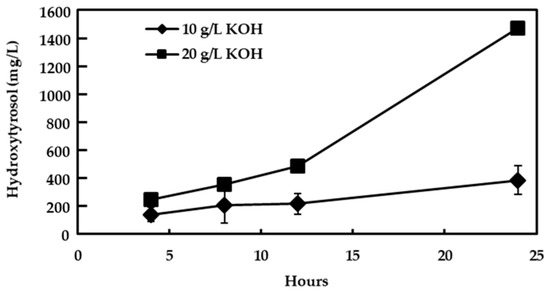 Evolution of hydroxytyrosol in the potassium hydroxide (KOH) solutions of whole olive leaves. Bars mean standard deviation of duplicates.