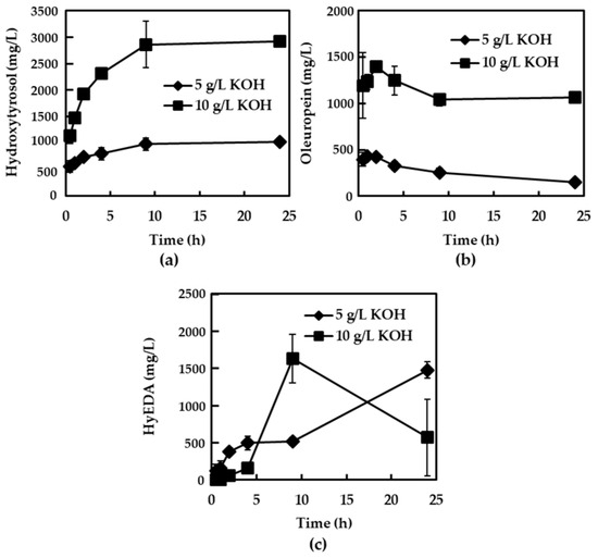 Under these conditions, a continuous enrichment of the 10 g/L KOH solution in hydroxytyrosol (Figure 2a)—reaching around 2800 mg/L during the first 10 h and remaining constant onwards—was observed. By contrast, the level of hydroxytyrosol obtained using the low alkali strength (5 g/L) along with a low concentration of oleuropein (Figure 2b) was only around 1000 mg/L, which means that this weak alkali strength achieved neither a high rate of oleuropein hydrolysis nor a high diffusion yield of this substance from the leaves. In fact, the content of oleuropein in the 10 g/L KOH solution rapidly increased during the first hour and slightly decreased past that point, with a final concentration of around 1000 mg/L. The detection of the dialdehydic form of elenolic acid linked to hydroxytyrosol (HyEDA) (Figure 2c) in the alkaline solutions is worthy of mention, because this substance is formed via the enzymatic action of β-glucosidase on the oleuropein molecule [26]. During the cutting of the leaves, the enzyme can be released, which allows for the transformation of the secoiridoid into HyEDA [27], its concentration increasing with time in the alkaline solutions, although it also decreased after 10 h in the 10 g/L KOH because of the high pH. Overall, the content of hydroxytyrosol in the potassium solutions could come from the alkaline hydrolysis of oleuropein and HyEDA, and a small quantity from the alkali transformation of verbascoside, which was not detected in these final liquids.
