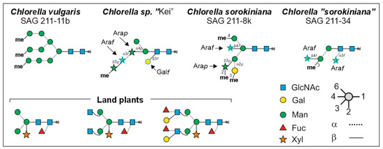 Green algae, and thus also Chlorella, are eukaryotic organisms, which render many of their proteins with asparagine-linked oligosaccharides, so-called N-glycans [26,27,28]. Concepts about the physiological role of these glycans in land plants are only just emerging [29]. Quite certainly, however, all land plants contain the very same set of N-glycan structures for which a highly conserved handful of glycosyltransferases is responsible [27].
