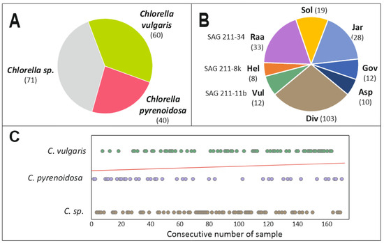 The food market in Europe is regulated. The Chlorella species that can be freely marketed as they do not fall under Novel Food Regulation 2283/2015 of the European Union are C. vulgaris, C. pyrenoidosa and C. luteoviridis (now renamed as Jaagichlorella luteoviridis) (https://www.algae-novel-food.com/output/algae-novel-food/download.pdf, accessed 6 September 2024). Among our collection of 172 samples, almost half of the products did not provide a species name, the rest being split up into C. vulgaris and C. pyrenoidosa (Figure 2, Table S1).
