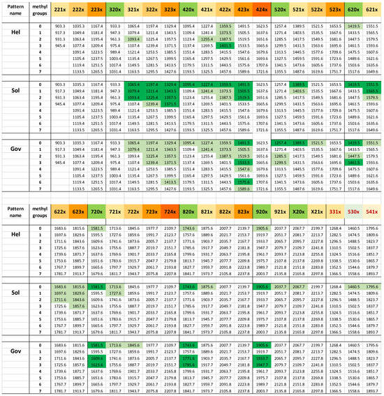 To get firm ground under our feet, we first established the possible composition of the mentioned masses. Our initial work had shown the hexoses mannose and galactose and the pentoses arabinose and xylose and, of course, HexNAc as the building blocks of the “club 1329” members [30]. A glycan mass can then be annotated in terms of the number of hexoses, HexNAc and pentoses and the number of methyl groups. A MALDI reading can be easily converted to a composition using the “algae mass converter” (Table S2). The [M + Na]+ value 1329 serves as an example for a glycan with three hexoses, two HexNAcs (i.e., GlcNAc) and three pentoses, and is annotated as os3230. m/z = 1343 then translates into os3231 and so on. The many combinations—realized or not by nature—can be listed in a spreadsheet as shown in Figure 3 and Table S4.