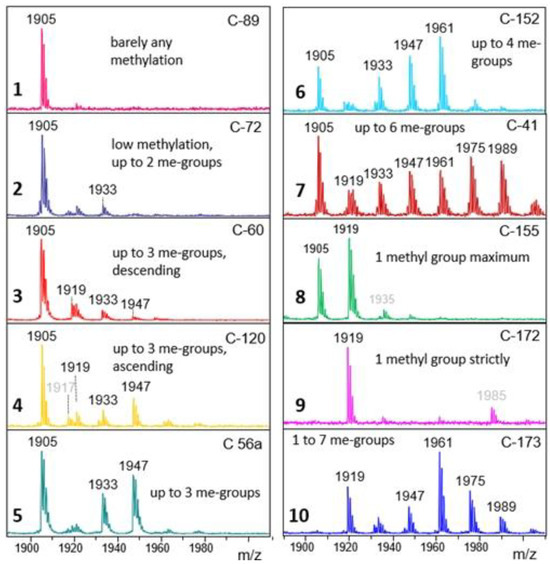 Ten characteristic patterns of O-methylation of the oligomannosidic N-glycan Man9 (Man9GlcNAc2). The numbers in the upper right corners refer to the respective Chlorella product (Table S1). Peaks are annotated with the nominal m/z values of the [M + Na]+ ions. Note that in this and all following spectra large peaks can be followed by a [M + K]+ satellite. Peaks annotated with gray color are unrelated structures.