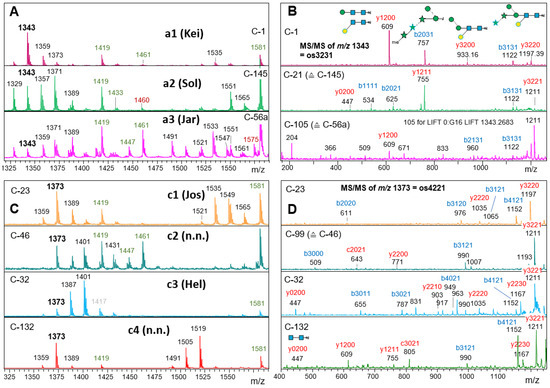 Seven distinct patterns of the medium mass range of microalgal N-glycans. MS1 spectra are shown on the left, LIF-MS/MS spectra of m/z = 1343.4 (panels (A,B)) and 1373.4 (panels (C,D)) on the right. In A and C, oligomannosidic glycans are annotated in green, K-adducts in grey and the low abundance indicator mass for “Sol” in red. Fragments are tentatively assigned as y (in red) and b (and c; in blue) ions with the numbers of hexose, HexNAc, pentose and methyl constituents. Cartoons are added where possible. The MS/MS spectra indicate different structures for all chosen precursor masses.