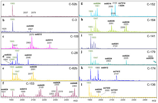 Twelve variant spectra of the high-mass region of Chlorella N-glycans. Oligosaccharides (os) are characterized by the numbers of hexose, HexNAc, pentose and methyl constituents, whereby X stands for 10. Oligomannosidic glycans are annotated in green,.