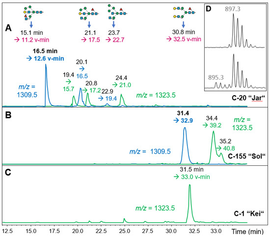 PGC-LC-ESI-MS with conversion to standardized retention times (v-min). Panel (A) shows the extracted ion chromatograms for os3230 and 3231 for a “Jar”-type product (C-20) together with the elution positions of internal standards obtained from porcine brain. Panel (B) depicts the elution of os3230 and 3231 in a product with a “Sol”-type pattern. These elution characteristics were also found for several other samples (C-15, C25, C-43 for “Jar” and C-21, C-89 and C-125 for “Sol”). Chromatogram (C) shows that the major glycan of the “Kei” sample C-1 does not co-elute with the isobaric glycans of “Jar” and “Sol”. Arrows at the top indicate the elution times of m/z = 895.3 brain glycans [35] and 13C4-labeled A4A4F6 [36,37], which were used to calculate v-mins (colored) from the initially recorded values (black). Insert (D) shows the spectrum of the isotope-labeled standard A4A4F6 alone or as part of a sample. Experimental retention times (v-mins) are written in black, standardized retention times in colored font.