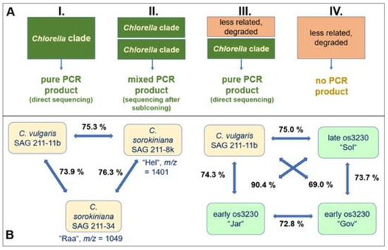 DNA barcoding of Chlorella products. (A): Scenarios of DNA barcoding with primers designed for Chlorella-clade microalgae. One rectangle symbolizes a product derived from one microalga strain. Peach-colored background indicates a strain that gave no PCR product. (B): Sequence identities of the ITS1-5.8S-ITS2 region (Supporting Information; Sequences) of selected samples. The comparison on the left involves strains with known, highly deviating glycan structures. The right block compares strains with partially identical features, i.e., oligomannose methylation in C. vulgaris and “Gov” on the one hand and the structure of os3230 (m/z = 1329) in “Jar” and “Gov” on the other. The attributes “early” and “late” refer to the elution times of the respective glycans. A complete identity matrix is presented in Figure S7.