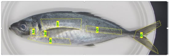 Based on previous studies by [,] and observations of the photographs captured, we examined six distinct body parts, as depicted in Figure 2. Parts 1, 4, 5, and 6 were selected based on their significant color differences, whereas parts 2 and 3 were selected based on samples being easily damaged and reddish. The average color of each part was quantified using the Lab color space system, employing the OpenCV and Skimage libraries in Python. To assess the luminance of the fish’s eyes, we initially separated the eyes using ImageJ software (ImageJ2 2.9.0/1.53t) []. Subsequently, the average eye luminance was calculated with the “imager” package in R (Version 1.3.959), which is designed for image processing.