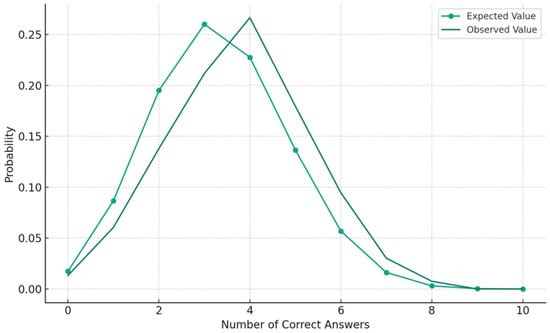 For the binomial distribution, the accuracy of the visual judgment of the freshness of participants was 3.78 (SD = 0.49). From this, we estimate that 37.8% of Japanese individuals gave correct answers, which is higher than the expected value, assuming a binomial distribution. However, the capacity for freshness estimation varies widely from one person to another. This is depicted in Figure 3, where seven participants could not provide even one correct answer. Conversely, four other participants achieved eight correct answers (and 80% depicts extremely high judgment accuracy when we consider the existence of similar fresh fish in alternatives of selection quizzes). The observed value line is on the right side of the expected value line in Figure 3. From this, we can conjecture that there were participants who could detect freshness from photographs of fish with high accuracy, although the sensitivity and accuracy differed among general consumers.