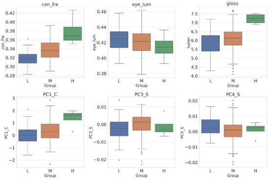 Figure 4 highlights the variables that exhibited significant differences among the low, medium, and high correctness rates (LMH) groups (p < 0.05). Notably, these groups showed significant variations in measured freshness (con_fre), gloss, color characteristics (PC1_C), and body shape features (PC3_S and PC4_S).