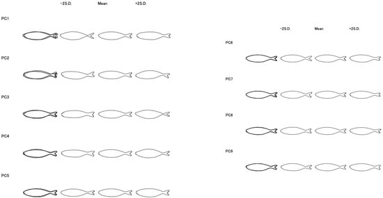 Morphological changes in body shape to changes in principle component score. Note: −2 SD: number of imaginary fish for which the principle component score is at the value of mean − 2 standard deviations; mean: number of imaginary fish for which the principle component score is at mean; +2 SD: number of the imaginary fish for which the principal component score is at the value of mean + 2 standard deviations.