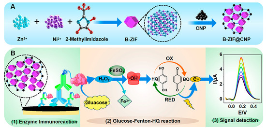 The three-stage cascade amplification process involved B-ZIF@CNP modification, enzyme immunoreaction, and the glucose–Fenton–HQ reaction. The TCAE-bioanalysis procedure is presented in Figure 1B, which comprises three main steps following the preparation of the B-ZIF@CNP/Ag-modified AuE: