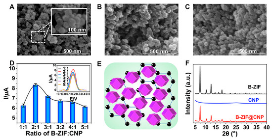 Characterizations of nanoparticles. (A) SEM of B-ZIF; (B) SEM of CNP; (C) SEM of B-ZIF@CNP nanocomposites; (D) ratio of B-ZIF and CNP for B-ZIF@CNP; (E) mode of B-ZIF@CNP nanocomposites; (F) XRD patterns of nanoparticles.