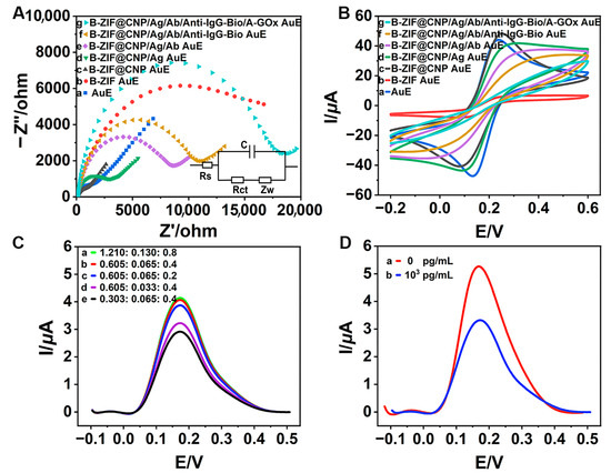 The CV and EIS curves were analyzed to better understand the electrochemical behavior during the modification process. In the Nyquist EIS diagram shown in Figure 3A, the B-ZIF (b, red curve) exhibited a larger semicircular arc diameter compared to the bare AuE (a, blue curve), indicating that the B-ZIF increased electrical resistance, which hindered electron signal transfer. Notably, the arc diameter of the B-ZIF@CNP nanocomposites (c, black curve) was significantly smaller, even less than that of the bare AuE, suggesting that the presence of CNP enhanced the conductivity of the bare AuE and substantially improved electron signal transfer. When modified with B-ZIF, the charge transfer resistance (Rct) of the AuE increased to 11,094 Ω, indicating worse conductivity (Table S1). Conversely, the Rct value decreased to 682 Ω with the B-ZIF@CNP nanocomposites, achieving the lowest resistance and optimal conductivity. The synergistic effects between B-ZIF and CNP demonstrated superior conductivity and effective preparation for B-ZIF@CNP. Following this, the arc diameters gradually increased with the successive modifications of ZEN-BSA (d, green curve), ZEN-McAb (e, purple curve), Anti-IgG-Bio (f, yellow curve), and A-GOx (g, cyan curve) as the biochemical materials increased resistance and limited electron signal transfer.