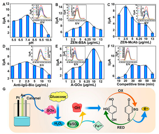 Optimization of key parameters: (A) pH; (B) ZEN-BSA; (C) ZEN-McAb; (D) Anti-IgG-Bio; (E) A-GOx; (F) competitive time; (G) schematic for generating electron signal.
