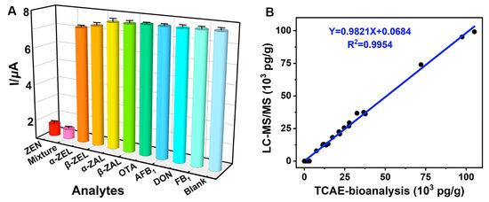 Additionally, a total of 26 authentic samples, highly suspected of ZEN contamination, were assessed using TCAE-bioanalysis and verified by LC-MS/MS (Table 1). For the TCAE-bioanalysis, 24 authentic samples showed ZEN-positive results ranging from 56.3 pg/g to 105.1 × 103 pg/g, with standard deviation (SD) values from 4.38 pg/g to 5.12 × 103 pg/g. In contrast, ZEN-positive levels detected by LC-MS/MS in 18 authentic samples ranged from 7.93 × 103 pg/g to 99.2 × 103 pg/g, with SD values from 0.53 × 103 pg/g to 7.33 × 103 pg/g. Notably, six ZEN-positive samples detected by TCAE-bioanalysis (56.3 pg/g to 3.15 × 103 pg/g) were judged as ZEN-negative by LC-MS/MS due to its higher LOD value (7.4 × 103 pg/g). The consistent ZEN-positive results between TCAE-bioanalysis and LC-MS/MS were represented by the equation Y = 0.9821X + 0.0684 (R2 = 0.9954) (Figure 6B), further demonstrating the reliability and practicality of TCAE-bioanalysis.
