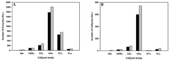 Of the 97,747 and 46,104 coding sequences (CDSs) responsible for carbohydrate metabolism identified in the metagenomes of consortia 1 and 2, a total of 2611 (2.7%) and 3046 (6.6%) were identified as CAZymes with a cut-off E value of <1 × 10−5, respectively. The identified CAZymes included 1579 (60.5%) and 1807 (59.3%) GHs; 656 (25.1%) and 759 (24.9%) GTs; 211 (8.1%) and 282 (9.3%) CEs; 97 (3.7%) and 98 (3.2%) CBMs; 53 (2.0%) and 66 (2.2%) PLs; and 15 (0.6%) and 33 (1.1%) AAs in consortia 1 and 2, respectively (Figure 2A). Overall, CAZymes were more abundant in consortium 2 than in consortium 1. Relative to the number of GHs, the numbers of other CAZymes across both consortia were: GHs >> CEs > PLs > CBMs >> GTs > AAs. The relative abundances of CAZymes in the metagenomes suggest that hydrolysis of polysaccharides and their derivatives serves as the main enzymatic reaction for complex carbohydrate structures [20].