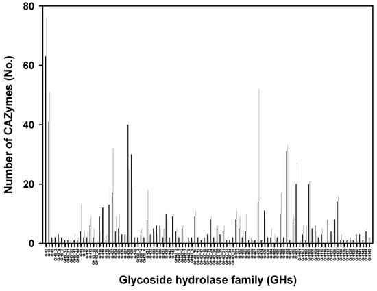 CAZymes with signal sequences that were predicted to be excreted by the bacteria displayed different patterns of abundance compared with the CAZymes overall (Figure 2B). Among the total predicted secreted proteins identified in consortia 1 and 2, 711 (27.2%) and 892 (29.3%) were CAZymes, respectively. Among these, 599 (84.2% of the total secreted proteins) and 743 (83.3% of the total secreted proteins) were GHs, 64 (9.0%) and 78 (8.7%) were CEs, 25 (3.5%) and 38 (3.9%) were PLs, 18 (2.5%) and 22 (2.5%) were CBMs, 4 (0.6%) and 4 (0.5%) were GTs, and 1 (0.1%) and 7 (0.8%) were AAs in consortia 1 and 2, respectively. The overall abundance profile for the secreted CAZymes was GHs >>> CEs >> PLs > CBMs >> GTs ≥ AAs. These results demonstrate that GHs were the predominant enzymes among the predicted extracellular proteins produced by the in vitro consortia for the digestion of various polysaccharides in dietary fibers. The consortia also had abundant genes for CEs and PLs, which assist GHs in polysaccharide degradation by modifying the polysaccharides [5,19].
