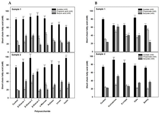 To test the abilities of the in vitro gut microbiome consortia to ferment different polysaccharides, we measured the levels of acetic acid, butyric acid, and propionic acid in culture media after the consortia were incubated for 120 h in culture broth supplemented with 1% (w/v) various polysaccharides. In comparison with control cultures without polysaccharide supplementation, both consortia increased the amounts of butyric acid and other SCFAs in cultures containing β-glucan 1 (barley) and β-glucan 2 (oats) (Figure 4A).