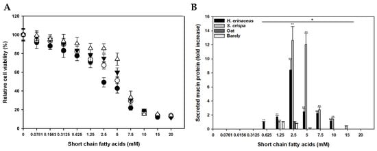 To measure the levels of secreted mucin, we detected MUC2/MUC5AC glycoproteins by ELISA in the culture supernatants of HT-29 cells adapted with different concentrations of SCFAs. Mucins were detectable in the supernatants of HT-29 cells treated with SCFA concentrations ranging from 0.625 mM to 15 mM (Figure 5B). No mucins were detected in supernatants of non-adapted HT-29 cells or HT-29 cells treated with SCFA concentrations less than 0.625 mM or more than 15 mM. The optimum concentration for mucin secretion was 2.5 mM SCFAs in most samples, except for the samples treated with SCFAs from cultures supplemented with barley. The SCFAs derived from cultures supplemented with H. erinaceus or S. crispa were more effective at inducing mucin secretion than those derived from cultures supplemented with oats or barley. The treatment of HT-29 cells with 2.5 mM or 5 mM SCFAs derived from cultures supplemented with S. crispa increased mucin secretion more than 12-fold. When the HT-29 cells were treated with the SCFAs derived from cultures supplemented with H. erinaceus, mucin production was increased 8-fold at an SCFA concentration of 2.5 mM compared with that in the untreated control. However, the mucin secretion induced by 2.5 mM SCFAs derived from cultures supplemented with H. erinaceus or S. crispa declined by 75% at SCFA concentrations of 5 mM and 7.5 mM, respectively. These results show that the SCFA mixtures enhanced mucin secretion by HT-29 cells at low concentrations, but had the opposite effect at high concentrations because of cell proliferation or apoptosis [35]. Indeed, mucin secretion could be regulated by the variable compositions of butyric acid, acetic acid, and propionic acid in the SCFA mixtures [35].